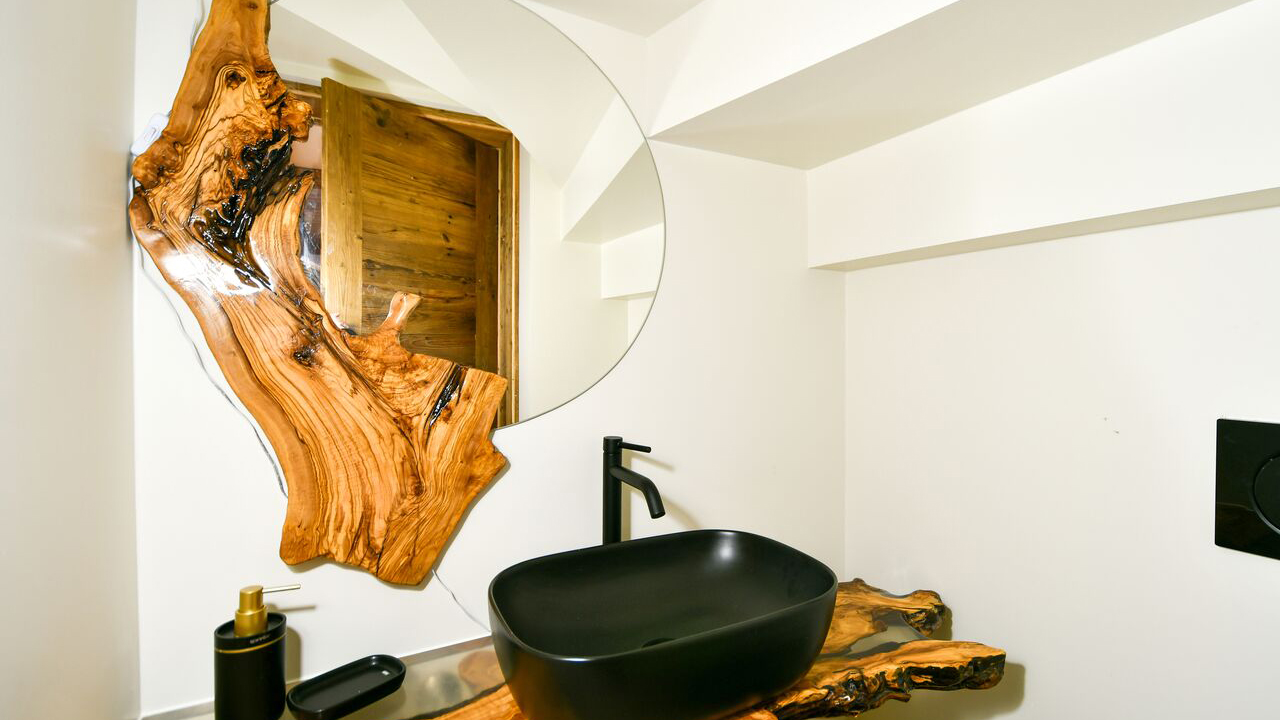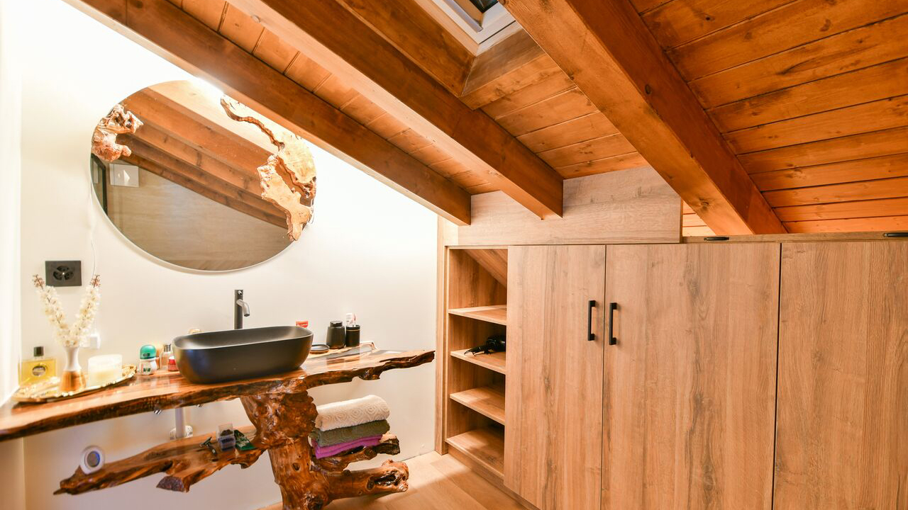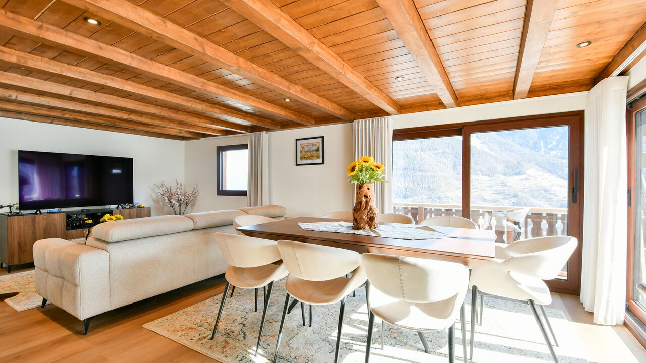 The main living room consists of a fully-equipped and modern kitchen along with a dining and sitting area. From here you can access the spacious terrace with panoramic mountain and valley views.