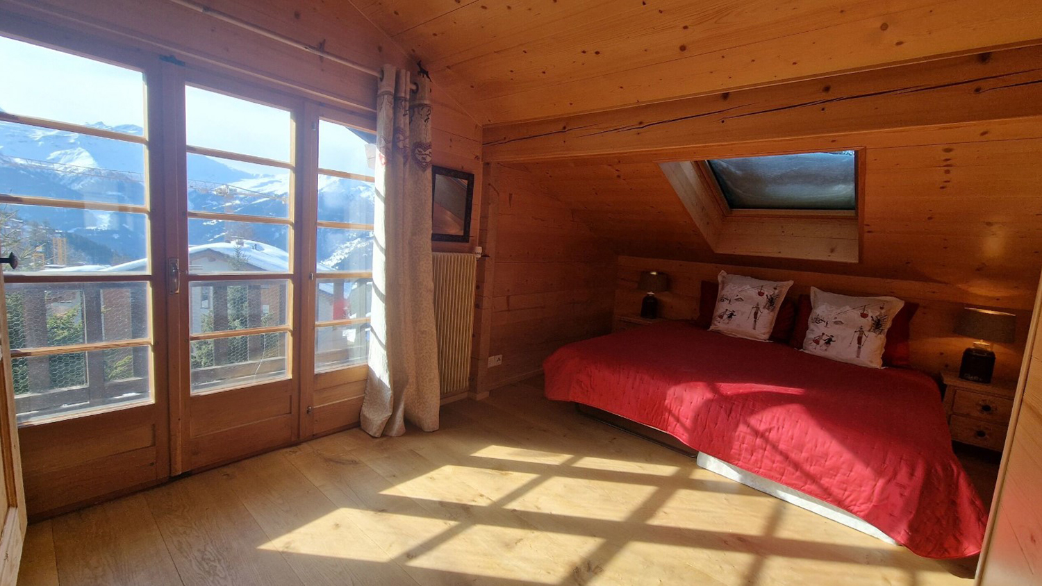 Het chalet ligt op het zuiden en vanaf het grote balkon heeft u een prachtig en weids uitzicht over de bergen en de vallei.