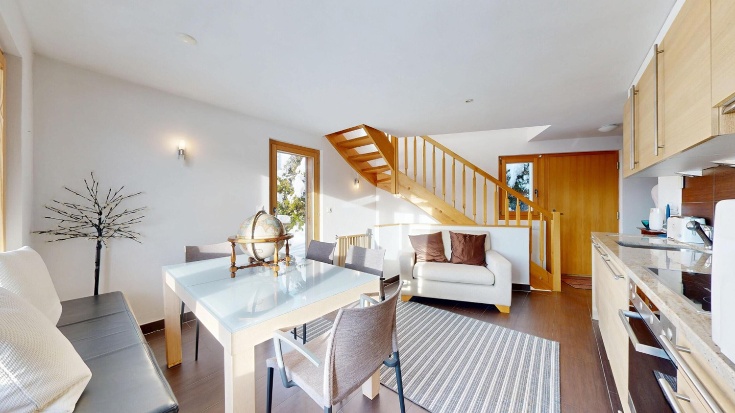 Buiten zijn er zowel een groot terras als meerdere balkons om te genieten van het uitzicht over de bergen en het dorp.