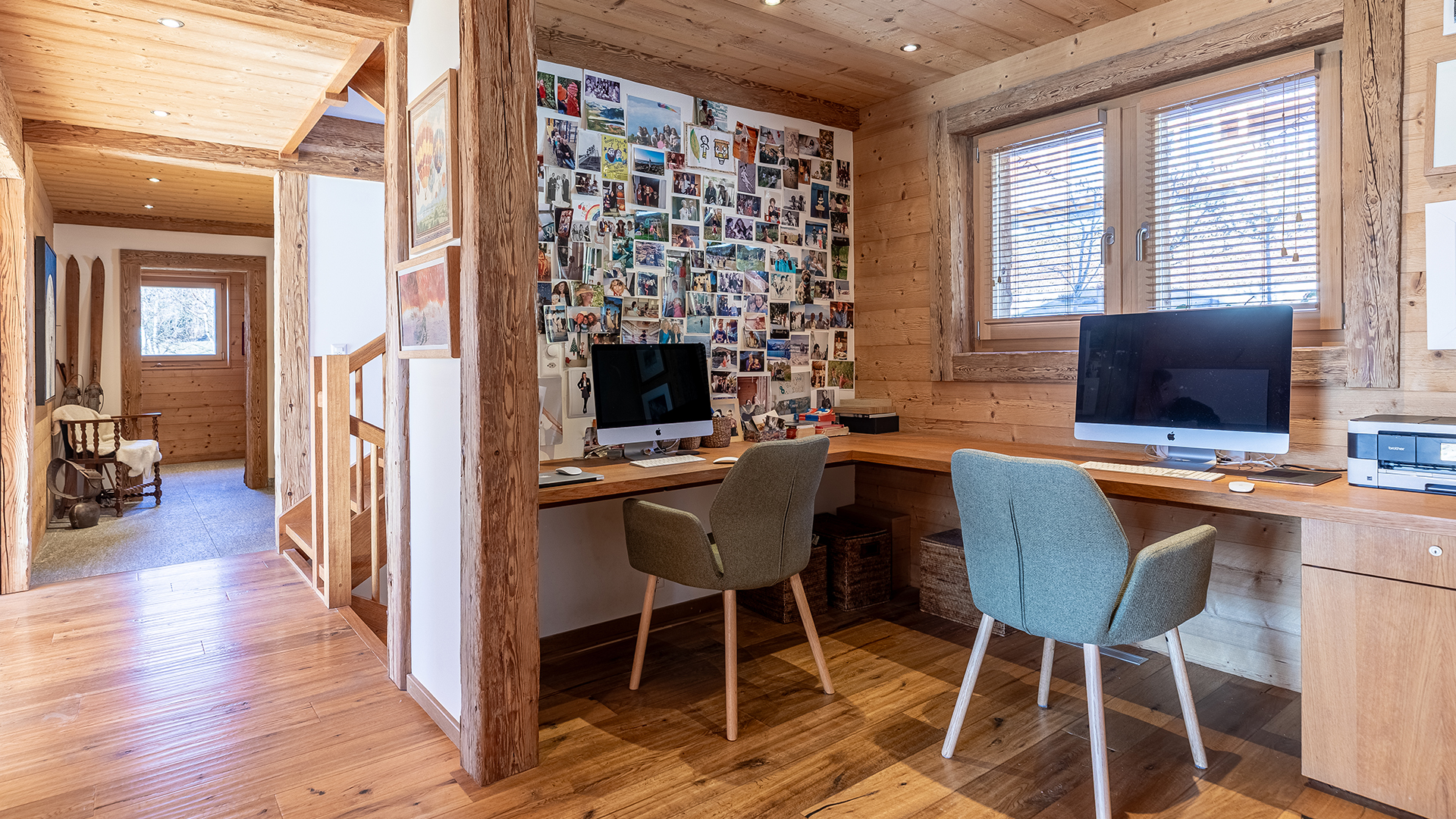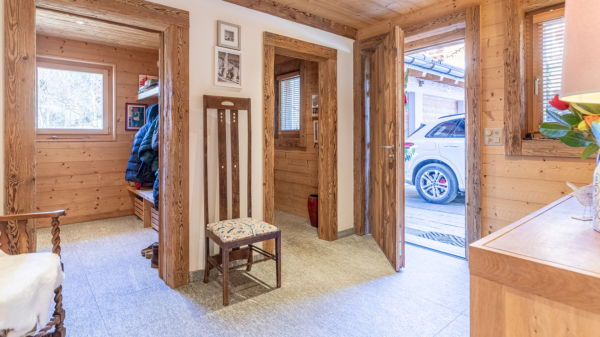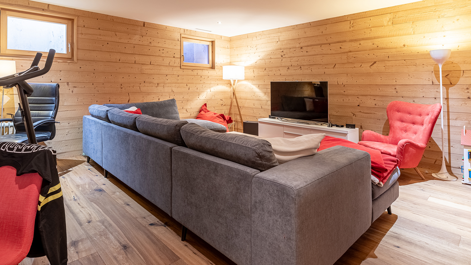 The lower ground floor offers a large multi-purpose room, a bright garden-access bedroom, a bathroom, laundry room, wine cellar and ski storage.